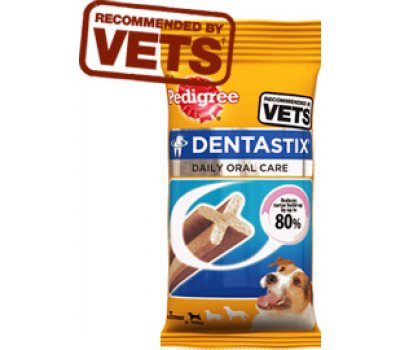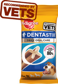 Pedigree Dentastix has a unique X shape and, when fed daily,the combination of its special texture and active ingredients, is scientifically proven to help reduce tartar build up by up to 80%.