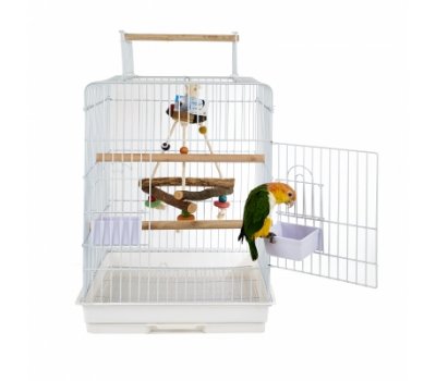 The Rainforest Cages Santa Monica White cage is suitable for Cockatiels, Small Parrots, e.g. Senegals and other similar sized birds. The Santa Monica White cage features a design which opens into an open top cage, a plastic base with coated wire construction, a pull out cleaning tray with coated wire construction and a large swing opening front door. The Santa Monica White cage includes an external perch, two internal perches and two feeding bowls.