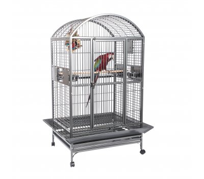 The Rainforest Cages Santos parrot cage is suitable for African Greys, Amazons, Macaw, Cockatoo and similar sized birds. The Santos has a large front opening door and attractive dome top. Featuring 4 x 15cm internal stainless steel bowls. 1 x 93cm internal cage perch. In addition a large pull out cleaning tray and safety grill. On wheels for easy movement. Clock style front door lock and screw tight, spring loaded feeder door locks..